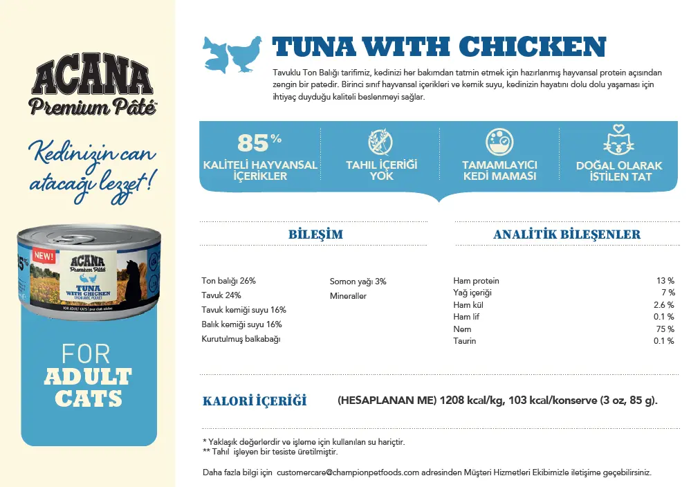 Acana’nın bu yaş mamaları, kedinizin günlük besin ihtiyaçlarını karşılamak için gerekli vitamin ve mineralleri içerir. Ton balığı, omega-3 yağ asitleri bakımından zengindir ve kedinizin cilt sağlığını desteklerken, tavuk eti ise lezzetli bir protein kaynağı sunar.