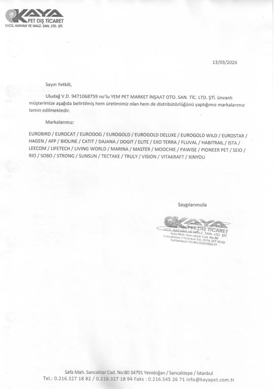 | Firma Adı: | Kaya Pet Dış Ticaret Evcil Hayvan ve Malz. San.Ltd.Sti |